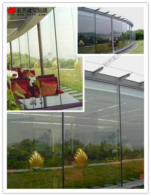 用戶性質:五星級酒店 存在問題:11層屋頂西餐廳,一邊望湖。天頂采用中空白玻璃,立面采用單玻鋼化玻璃。由于太陽直射,環境溫度非常高,難以坐享觀景。 解決方案:天頂采用外貼膜已達到可靠的隔熱效果,立面采用透光率極高的3M夜視膜。 產品型號:3M 太陽隔熱膜 RE15SIXARL 200m2 NV 45 280m2 貼膜部位:11樓餐廳天頂及立面, 安裝時間:2005年
